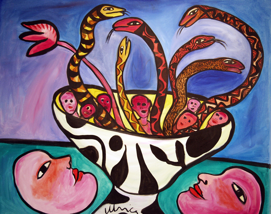 Ulrica målar gärna starka kvinnor och säger sig ha svårare att porträttera mannen. Möjligen är det han som är ormen. Hon fyller 70 nästa år och är piggare än många.