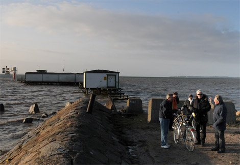 Många nyfikna samt medlemmar i Doppingarna samlades vid Kallbadhuset för att beskåda stormskadorna.