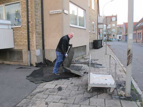 Rolf Ekström jobbar på Folkets Hus och plockar upp rester av tjärpapp som blåst ner från byggnadens tak.
