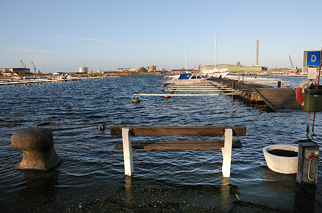 Vattennivån var betydligt högre än normalt även inne i Sockerbrukshamnen. Foto: Peter Nilsson.