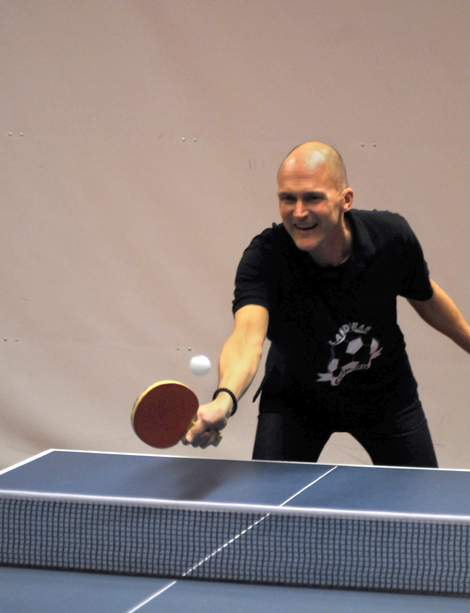 Cupgeneral Jan Stenblom minglade runt och såg ut att trivas. En pingismatch mot några väntade killar hann han också med.