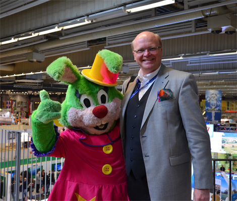 Göteborg ställde inte ut på mässan i år, men hade riggat upp med ett tiotal Lisebergskaniner att springa runt och charma besökarna. Här har de fått tag i Thorsten Karlén, destinationsutvecklare Landskrona stad, som inte verkar göra alltför stort motstånd.
