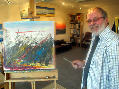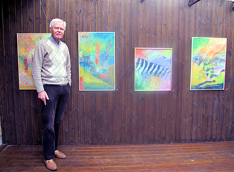 Den tidigare slöjdläraren är något av nestor, åtminstone bland konstrundans medverkande Landskronakonstnärer. Trots 80 år fyllda är nyfikenheten stor och ett ständigt sökande efter utveckling syns i konsten. På samlingsutställningen hade han exempelvis en bild från ett besök i Afrika.