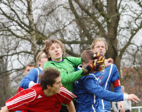 Andreas Borg gjorde en bra match i Wormos mål. Här visar han mod och beslutsamhet i luften. Foto: Leif Hammarström