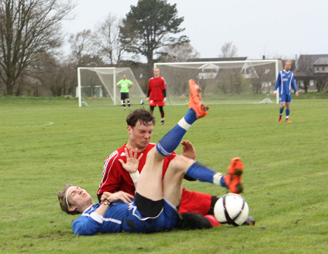 Simon Tollesson tar både boll och motspelare när han bryter ett Stehagsanfall.