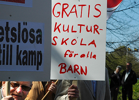 Ett par av skyltarna i årets 1 maj-demonstration.