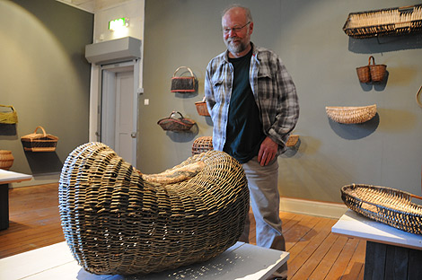 Det finns dock korgar i utställningen som inte används. Steen Madsen stegar fram till en märkligt formad korg och berättar att det rör sig om ett konstverk.