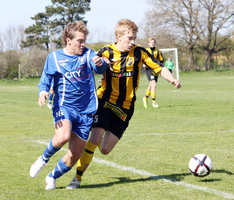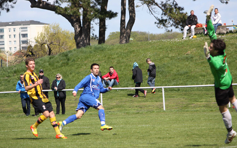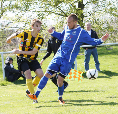 Niklas Nilsson – en av tre målskyttar – försöker stoppa ett högerinlägg.