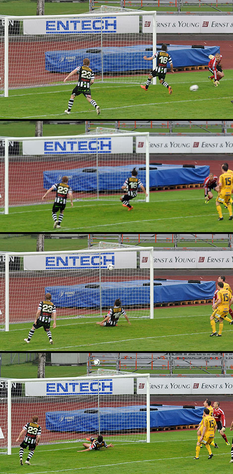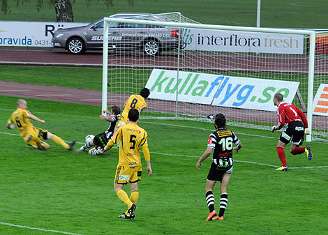 Fredrik Olsson petar in bollen i mål men blir avblåst för offside.