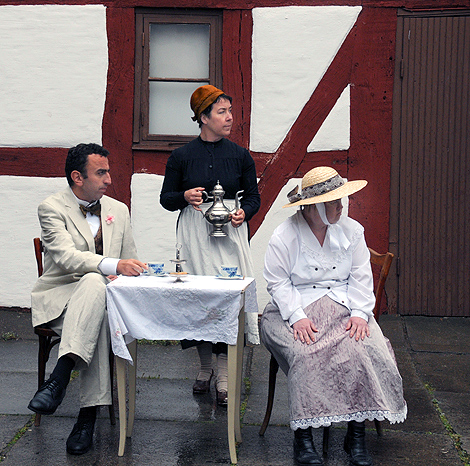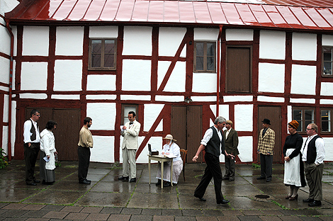Regnet krävde en del korrigeringar, för inte gick det att sitta direkt på den regnvåta trappan, men så snart en handduk avvärjt problemet kunde skådespelarna från Öresundsteatern och den numera rutinerade ensemblen från den dagliga verksamheten spela upp ett par scener ur pjäsen.