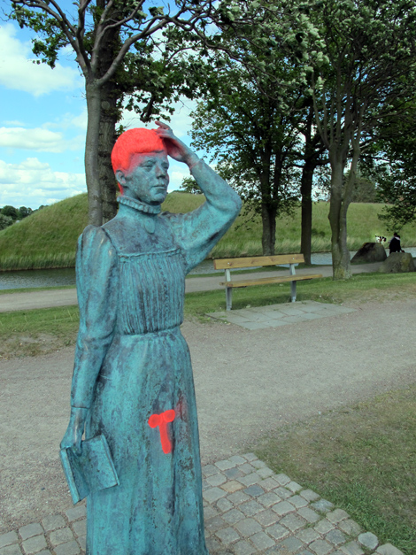 Under den gångna helgen har någon eller några roat sig med att färga håret och byta kön på Selma Lagerlöf- statyn längs med Linjen.