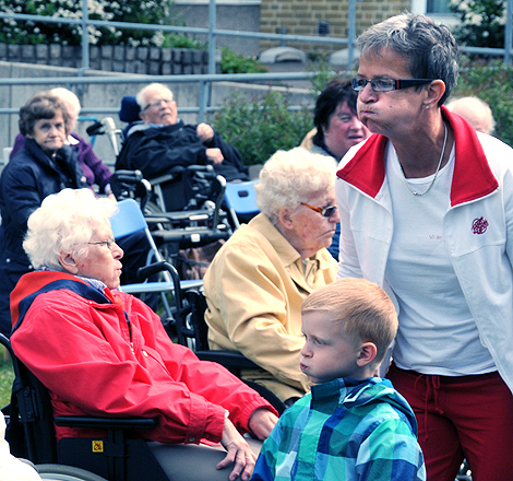 – Var är min?, undrade Viktor och tittade lite ängsligt efter danskan Grete. Snart hade de båda funnit varandra igen och dagens välbesökta gemensamma gymnastikpass på gården bakom gamla Vallgården kunde starta. Med liv och lust gav sig deltagarna, som fantastiskt nog hade ett åldersspann på 4-99 år, i färd med att motionera kroppens alla muskler.