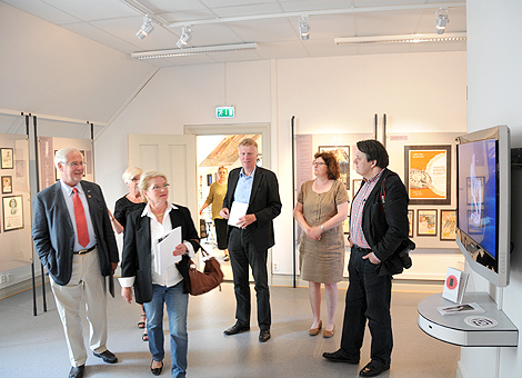 Göran Montan (M) från riksdagens kulturutskott, något skymd Gunlög Stenfelt , kulturnämndens ordförande (FP), ledamoten Kerstin Stråmark Johansen(M), i bakgrunden skymtar kulturintendent Birthe Wibrand, fritid- och kulturchef Göran Nyström, museichef Elisabeth Arvidsson samt Per Lindström, professor i fotografi tittar runt i Rum för reklam.