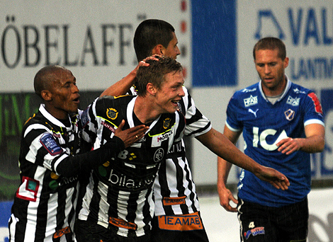 Lagkaptenen i Halmstad BK tillika Landskronabon Johnny Lundberg blir överlycklig sedan han nickat in 2-3 målet.