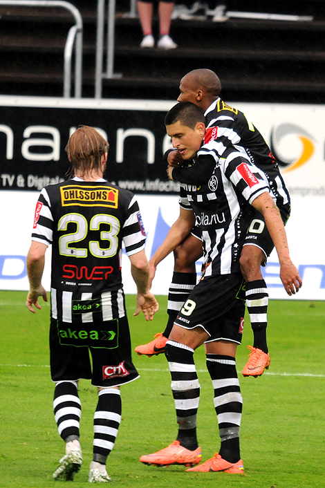 Landskrona BoIS nya kelgris, tvåmålsskytten Luka Mijaljevic, klappas om av Mathias Unkuri och Bradley Ralani efter sitt 2-2 mål.