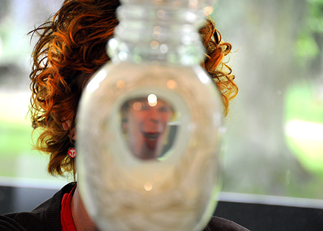 Irna My Lindqvist arbetar i graal men blästrar fram klarglaset.