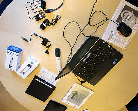 Här visas den avancerade pennan som i ljud spelar in en lektion och där eleven sedan med anteckningarnas hjälp kan gå tillbaka i ljudfilen och lyssna på ett speciellt avsnitt. Även en inbyggd scanner i en mus som låter texter överföras från ett dokument och in i datorns ordbehandlingsprogram väcker nyfikenhet.