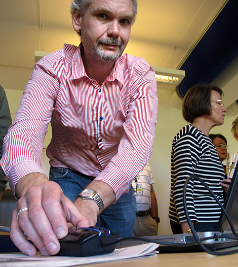 Även om det är pedagogiken som ska stå i fokus och dra nytta av de senaste tekniska landvinningarna så är det runt IT-teknikern Mattias Löwdell som premiärgästerna flockas.
