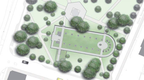 Gångstråken i Gamla kyrkans grund har vävts samman med de i omgivningen och det nya nedsänkta ”kyrkorummet” blir på så sätt en integrerad del av Stadsparken.