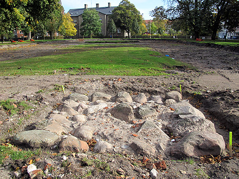 – Nu har arkeologerna tittat på området och dokumenterat en del stenar som lär härstamma från grunden till den medeltida kyrkan Sankt Johannis Baptistae, säger stadsträdgårdsmästare Siv Degerman.