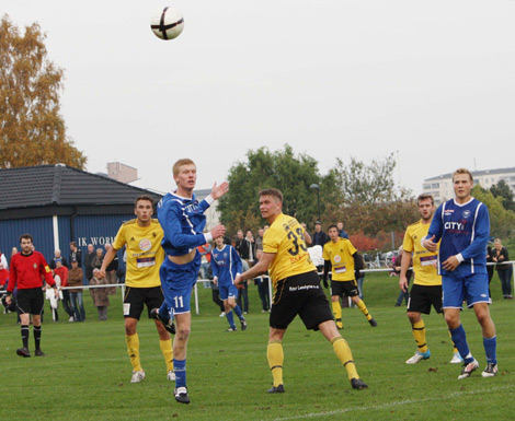Joakim Ramberg når högst i en nickduell, men bollen går utanför. Anton Kohlemainen (t h) tittar på. Foto: Leif Hammarström