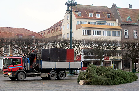 Förra årets präktiga och grova serbiska gran på Rådhustorget ersätts i år med en kortare frakt.