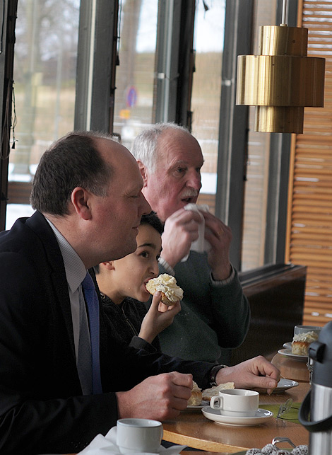 Tillsammans med kommunstyrelsens ordförande Torkild Strandberg delade hon sedan ut gåvor i form av badlakan och familjebiljetter till Karlslundsbadet samt ett litet häfte om offentlig konst i Landskrona innan det var dags att sätta sig till bords för en fika.