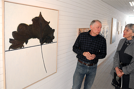 – Tavlan förestället ett löv som ligger på ett bord. Väggen i bakgrunden är vit och det är även duken som täcker bordet. Men väggen är målad med många färger, säger hon och maken, Niklas Anderberg, även han konstnär som tidigare ställt ut på Pumphuset, förklarar.