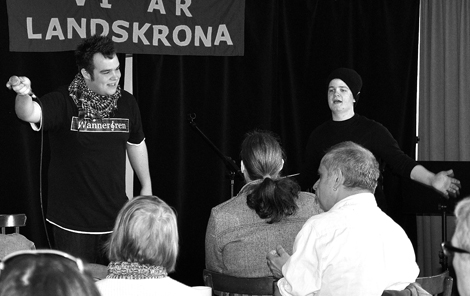 VäL:s – Vi är Landskronas – lördagcafé inför stadens 600-årsdag blev till en riktig fest. Många landskronabor sökte sig till teaterrestaurangen. Som mest var det uppåt nittio kaffesugna gäster bänkande runt borden och på golvet. Med ett program som spände från Selma Lagerlöf, via irländsk folkmusik och landskronitisk HipHop, till Anders Cösters poetiska fotoutställning, fanns det något för alla smakriktningar och åldrar. Och det sistnämnda märktes verkligen bland publiken. De yngsta gästerna satt i barnvagn och de äldsta hade mer än ett grått hår i kalufsen.