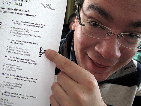 Men festen var inte slut med det. Dagens konferencier, Jan Nilson, bytte roll och blev frågesportsledare. Det var dags för Musik Quiz. Med hjälp av underfundiga musikillustrationer fick publiken gnugga geniknölarna kring snälla och ibland ironiska frågor om staden i vinden. Och det bjöds på live-illustrationer. Fride Nilson hjälpte till med den första illustrationen: Jimmie Hendrix’s Purple Haze. Och Victor Wannergren hjälpte till med den sista: Victors egen Skåne Huvudstad 2.0.