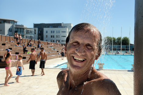 På TV-skärmen sveper drygt 100-bilder här en från ett badreportage. Svetten lackade på redaktionen och stans bästa badplats måste koras. Bild från Citadellbadet. Foto: Håkan Karlsson