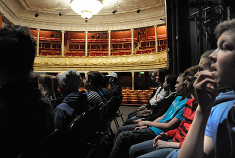 Sjuorna från Västervångskolan smått konfunderade över vad de gör på scen och vad det är man beskådar.