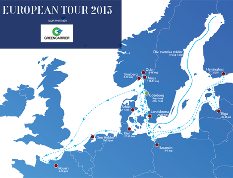 European Tour 2013 inleds i Norge. Det första hamnstoppet blir Tönsberg dit Ostindiefararen Götheborg har blivit inbjuden av Tönsberg kommun. Därefter seglar hon vidare till Moss för att slutligen nå Oslo där skeppet kommer att delta i firandet av den norska nationaldagen.