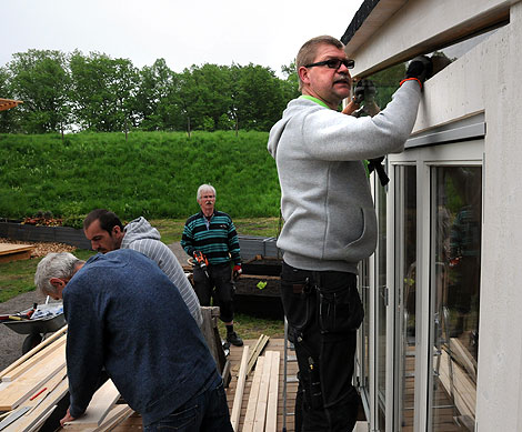 Per Olof Rosengren från Svanholms Glas hjälper Folkuniversitet att få till ett av de sista fönsterna.