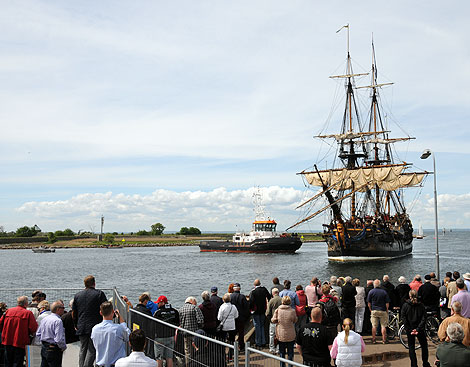 Kajerna kantades av nyfikna när hon majestästiskt gled in i hamnen.