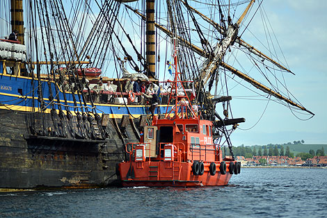 Bogseraren Dunker fick agera bogpropeller när det var dags att angöra Skeppsbrokajen.