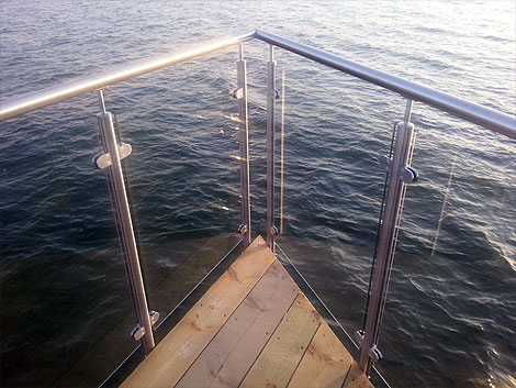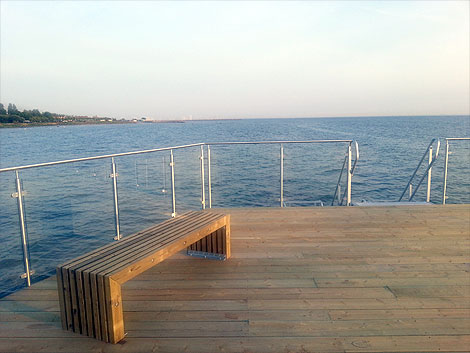 Det tilltagna soldäcket på 400 kvadratmeter har utrustats med tre badtrappor samt inglasat räcke runtom för att ge bättre vindskydd och höja känslan av komfort. Pålkonstruktionen under soldäck har också förberetts för en framtida bastubyggnad med vinterbadtrappa.