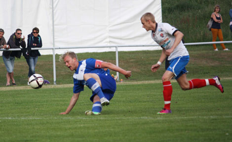 Linus Andersson grinar illa när han går omkull uppvaktad av en Åstorpsspelare.