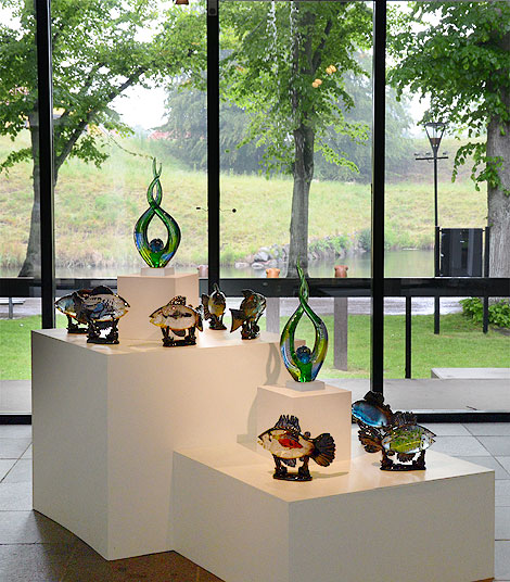 – 41-årige Micke blev mästare redan som 24-åring och har sedan dess skapat mängder av glas åt andra. Kul då, att här även kunna visa hans eget unika konstglas, säger Mia Widell när vi passerar ett stim av fiskar.