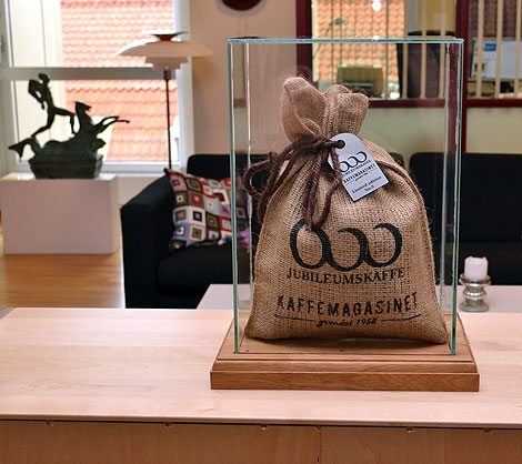 Som ett led i 600-årsfirandet, överlämnades igår en gåva till Landskrona stad från Kaffemagasinet. En mycket glad mottagare var kommunfullmäktiges ordförande Lennart Söderberg. Gåvan, en säck med rostade kaffebönor monterad i en glaskub från Kaffemagasinet, är tillverkad i ett mindre antal numrerade exemplar.