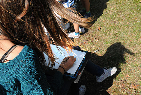 Stafflier som skänkts av Lions Citadella till museets kreativa verkstad kommer väl till pass även om en del väljer att måla med blyerts och med papperet tasttejpat på ett underlägg, likt Heol Chatelin, som fångar skuggan av sitt eget hår på sitt konstverk.