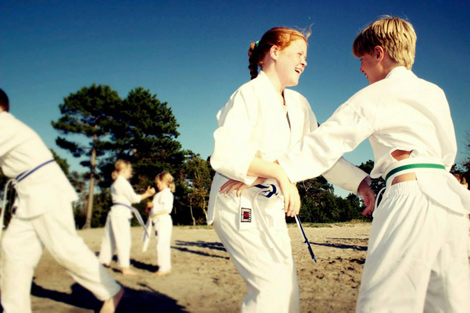 Det blev en bra uppslutning för Henka Dojo på terminens första pass i Lill Olas. Ett 20-tal barn, ungdomar och vuxna iklädda sina dräkter hade tagit sig ner till stranden och lika många föräldrar och syskon fanns på plats som åskådare.