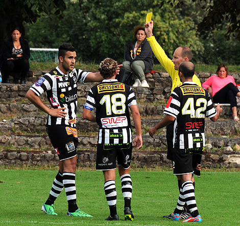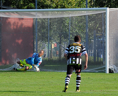 De grönklädda gästerna fick sedan ett gyllene tillfälle att göra 2-1 på straff. Det som föregick var dock något ytterst ovanligt. ”BoIS” målvakt, Ludvig Rhodin (HIF) var ute och skulle avstyra en kontring och fällde samtidigt en motståndare. Domaren pekade på straffpunkten och gav Rhodin ett gult kort. Målvakten sade då vad han tyckte om domaren vilket renderade i en utvisning. Nu hade ”BoIS” ingen reservmålvakt på plats så motståndarnas coach Anders Lindberg (jodå, han var svensk) bad domaren låta Ludvig Rhodin fortsätta matchen. Detta sade domaren ja till under förutsättning att han fick en ordentlig ursäkt. Så skedde och målvakten plockade därefter rent av straffen.