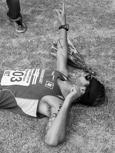 Plötsligt stöp en halvmaratonvinnare framför våra fötter. David Nordqvist från Trångsvikens IF var rejält medtagen efter sitt segerlopp.