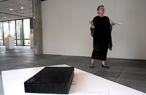 Konstintendent Birthe Wibrand visar upp rumänen Adi Mateis 5000 sammanfogade pennor.