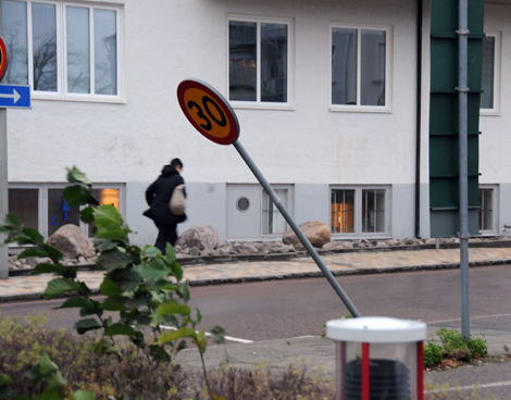 Om det var stormen eller något annat som fått skylten på Säbygatan att buga sig låter vi vara osagt.