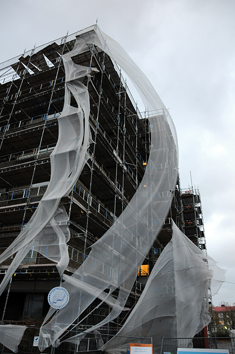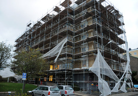 Det var spektakulära syner som mötte de förbipasserande på Säbygatan där man håller på att renovera Landskronahems fastigheter. Längst upp på byggställningarna låg trallar huller om buller och höll på att blåsa ner.