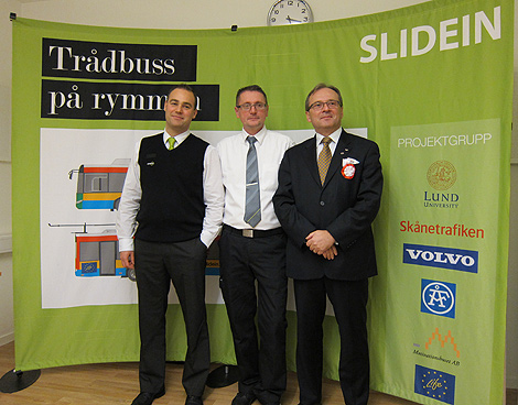 Lennart Söderberg och ambassadören provåker den uppladdningsbara SlideIn-bussen Elvis. Foto: Thorsten Karlén, Landskrona stad.