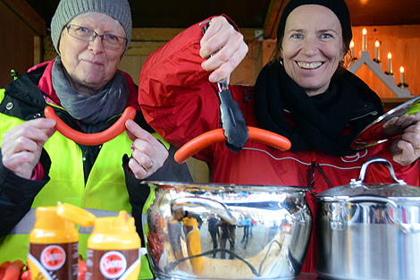 Eva Örtegren och Alinda Zimmander lockade med röda pölser i solidaritetens tecken.