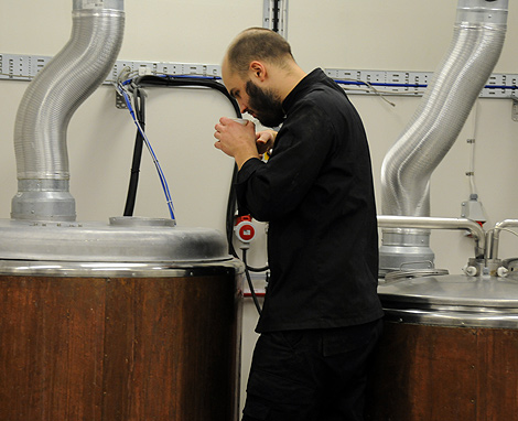 – Det gäller att ha full kontroll på var i processen man är och så gäller det att hela tiden använda sina sinnen, säger han och klättrar upp på ett av faten och öppnar. Han tar en plastmugg i handen, doppar ner den och fyller på med lite av mäsken och smakar.